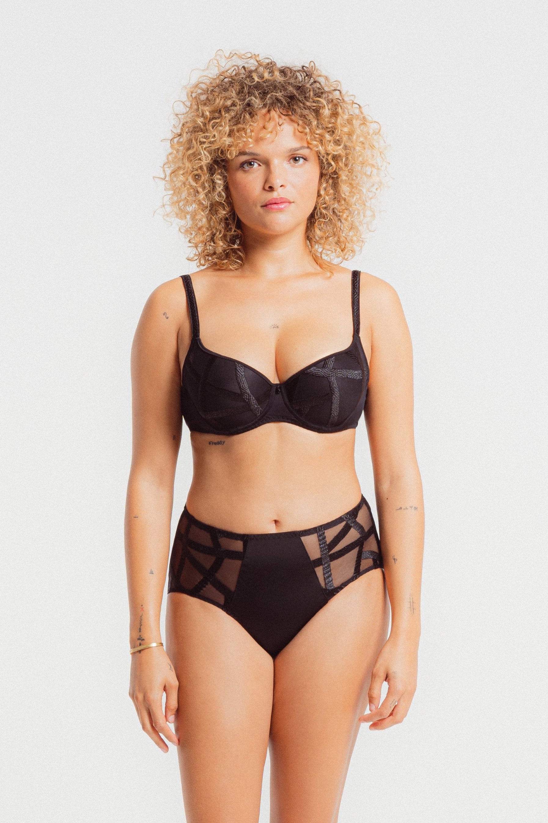 Serie full briefs feature soft satin microfiber and geometric embroidered tulle that subtly reveals the skin. The high, shaping cut smooths the waist and belly, while fine stitching ensures invisibility under clothing.