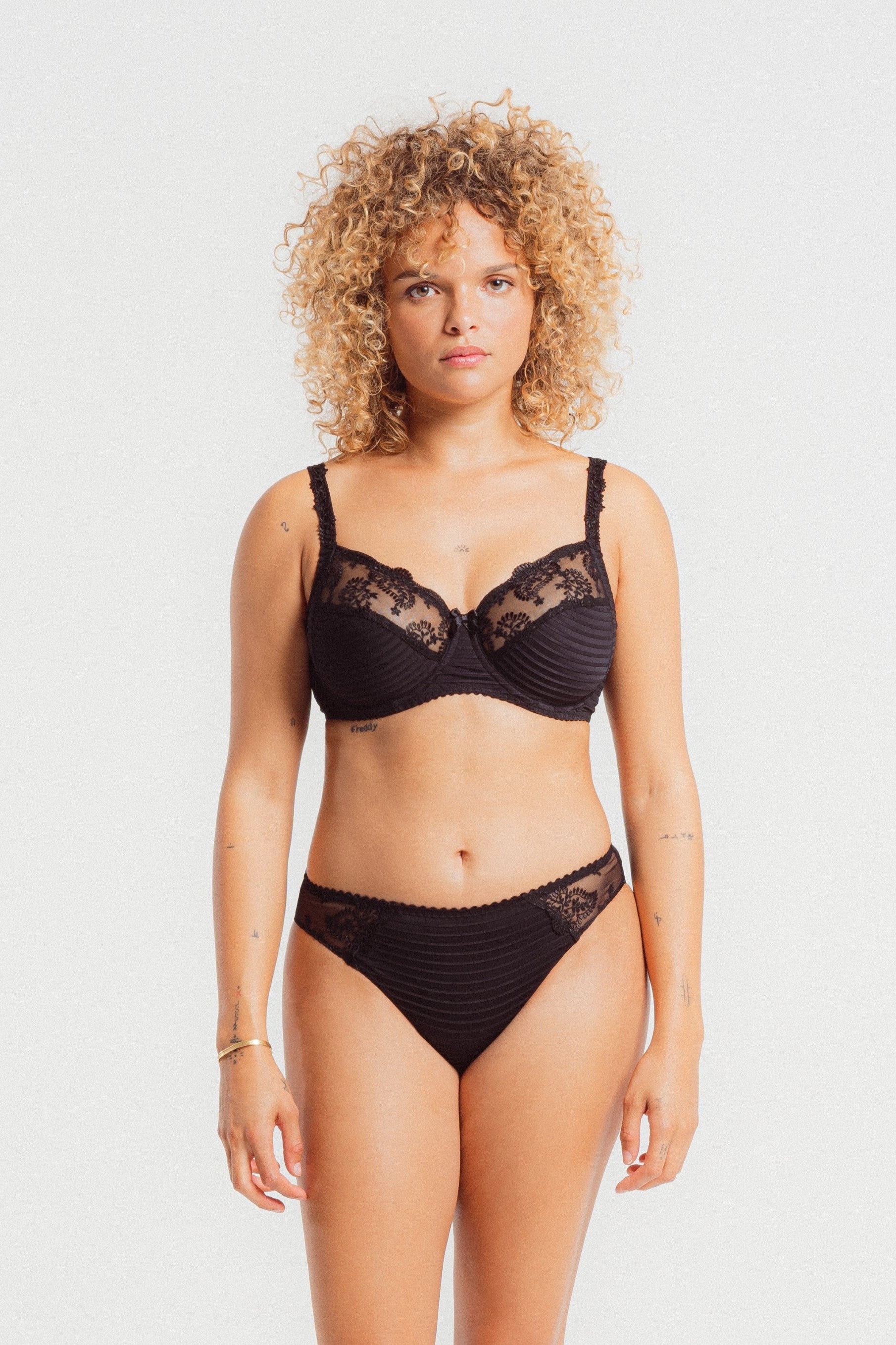 The Elise brief pairs a bi-elastic, pleated opaque mesh at the front with delicate pearl-effect leaf embroidery along the sides.